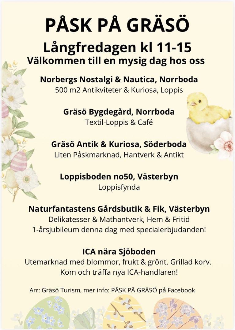 Under Påsk på Gräsö på Långfredagen, kan du besöka flera av öns verksamheter och träffa producenter och… läs mer inne i evenemanget