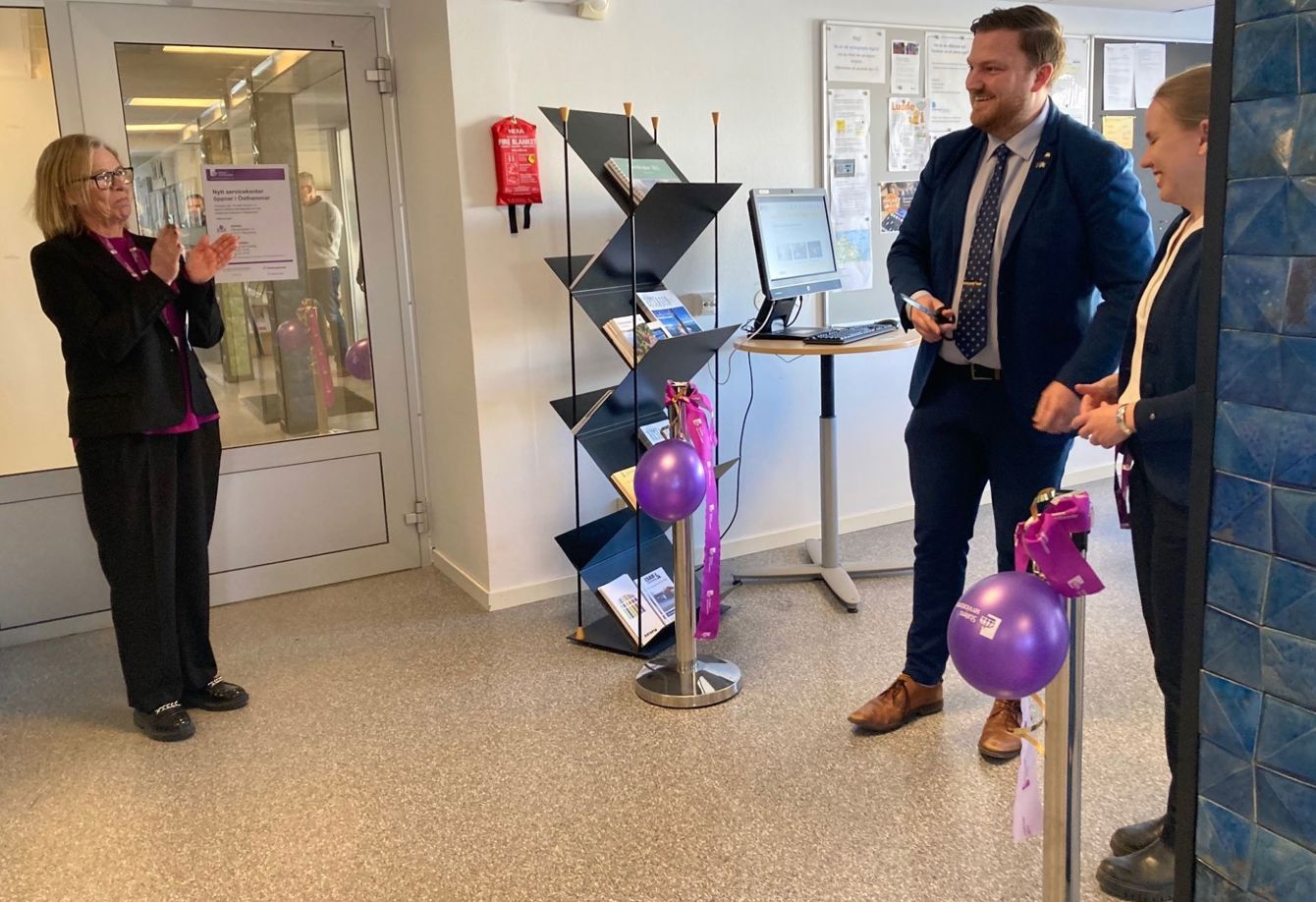 Nu får företagare och invånare i Östhammars kommun närmare till statlig service. På det nya servicekontoret i kommunhuset, Östhammar, kan invånare få stöd och vägledning i ärenden som gäller Arbetsförmedlingen, Försäkringskassan, Pensionsmyndigheten och Skatteverket. På bilden applåderar Tina Nitz, kontorsområdeschef, Fabian Sjöberg (M), kommunstyrelsens ordförande, och Mikaela Paajanen, servicehandläggare, som inviger det nya kontoret.