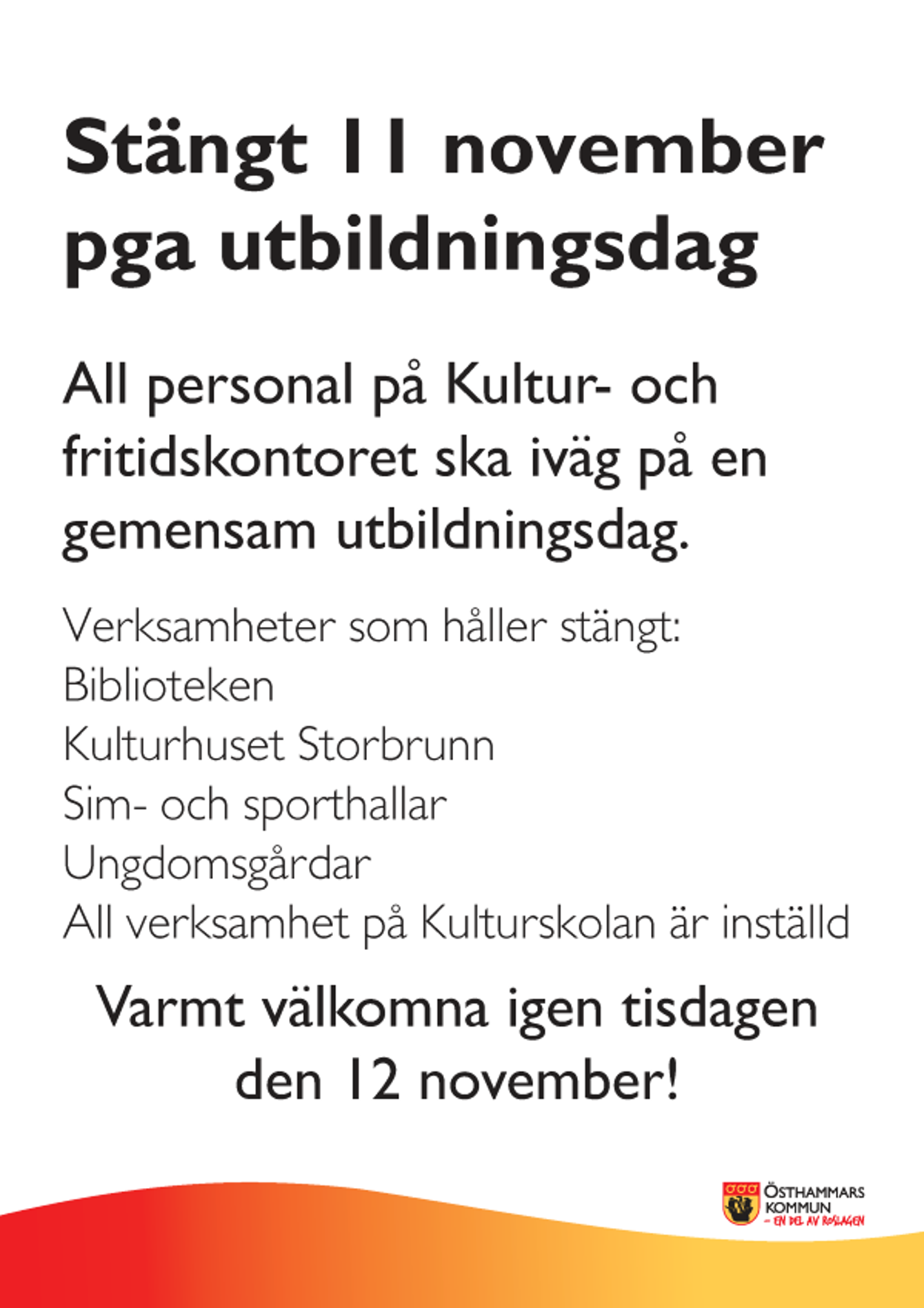 Den 11 november är all personal inom kultur- och fritidskontoret på en gemensam utbildningsdag. Berörda verksamheter som håller stängt denna dag är: biblioteken