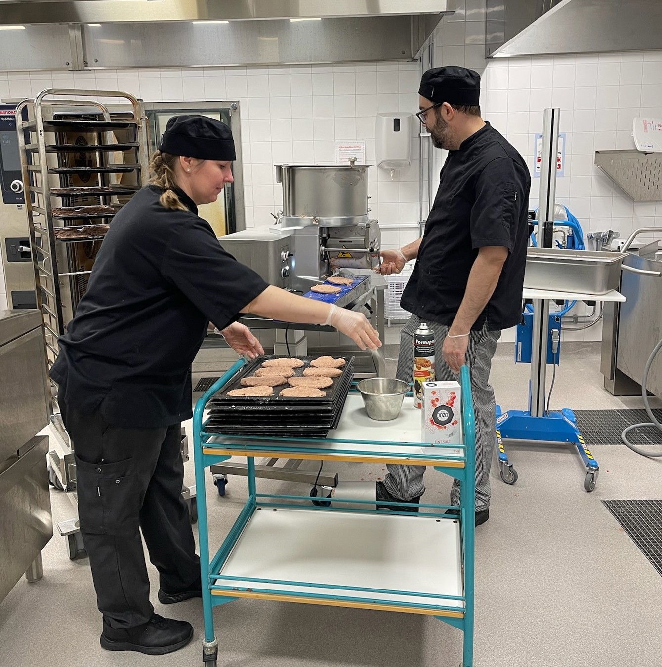 Kökspersonalen på Frösåkersskolan i Östhammar har förberett hamburgarna som kommer att tillagas och serveras till eleverna.