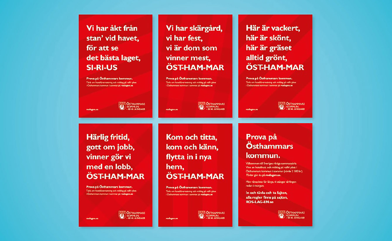 ”Här är vackert, här är skönt, här är gräset alltid grönt, Öst-ham-mar” och ”Härlig fritid, gott om jobb, vinner gör vi med en lobb, Öst-ham-mar”. Det är två av affischerna i en kampanj som kan placera Östhammars kommun på prispallen.