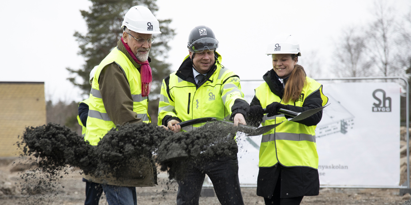 Även om området har varit avspärrat ett tag och vissa byggnader redan rivits så börjar nu en ny fas i projektet där man planerar att börja schakta för att gjuta grundplattan redan vecka 13. Jacob Spangenberg (kommunstyrelsens ordförande), Josefine Nilsson (Barn- och utbildningsnämndens ordförande) och Lasse Svensson (chef Sh bygg) höll i spaden som symboliserar det samarbete Östhammars kommun inlett med entreprenören Sh bygg. Tillsammans ska vi bygga en ny sorts skola utan de traditionella långa korridorerna med fyrkantiga klassrum. Istället kommer vi att få se en miljö som lättare erbjuder individanpassade lösningar för lärande.