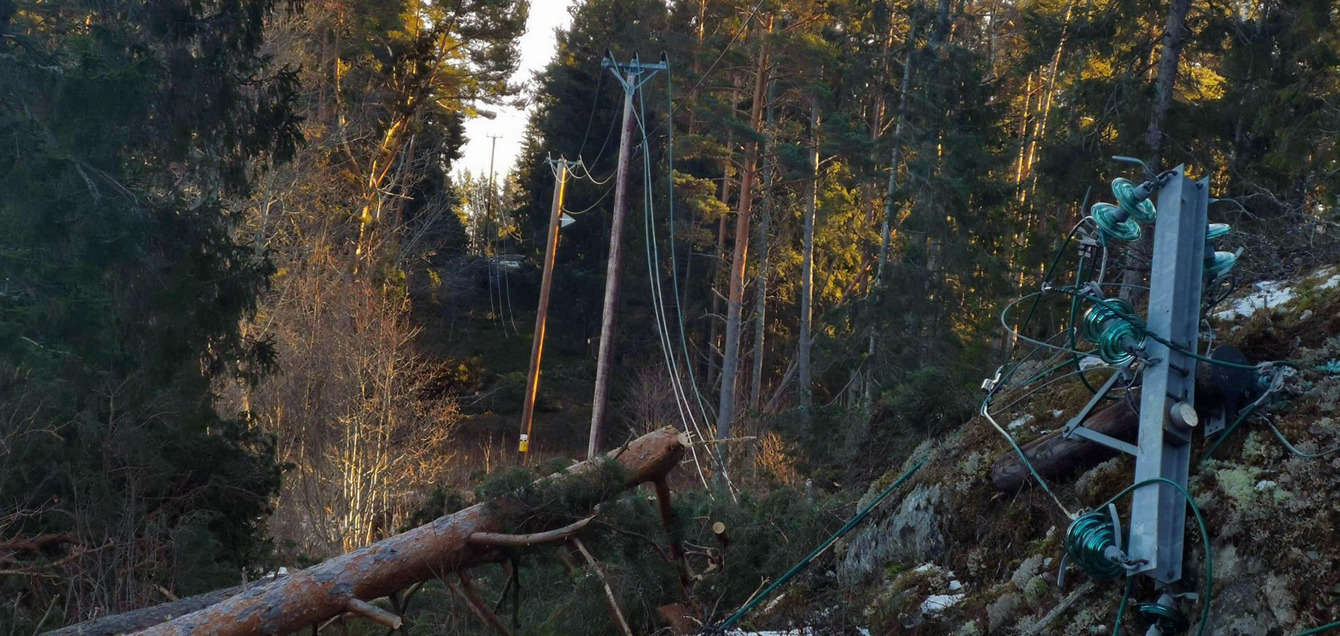 Vattenfall Eldstribution är tacksamma för om de som ser träd på ligger på ledningar anmäler det till telefon 020-82 58 58. Tänk på att aldrig gå fram till en elledning som fallit till marken då den kan vara strömförande. Försök inte själv att ta bort träd som blåst omkull på en elledning.