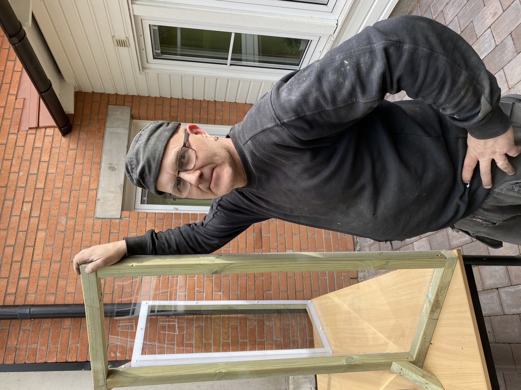 Ett bord, några reglar och en plexiglasskiva utgör stommen i den skärmvägg som han har byggt och som fungerar som mötesplats mellan anhöriga och boende på Parkvägen.