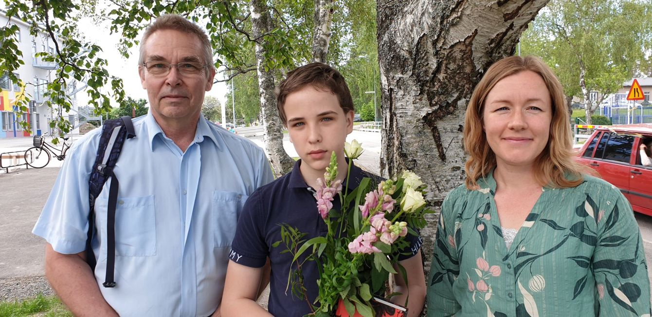 Det årliga finska språkstipendiet delades ut vid skolavslutningen den 10 juni. Årets pristagare är Timo Peltonen från Frösåkersskolan. Han har under åren visat särskilt intresse och entusiasm i modersmålet finska och fick som uppmuntran ett presentkort, en bok och finskt godis. På bilden ses han tillsammans med pappa Jyrki och Suvi Kokko, koordinator för finskt förvaltningsområde.