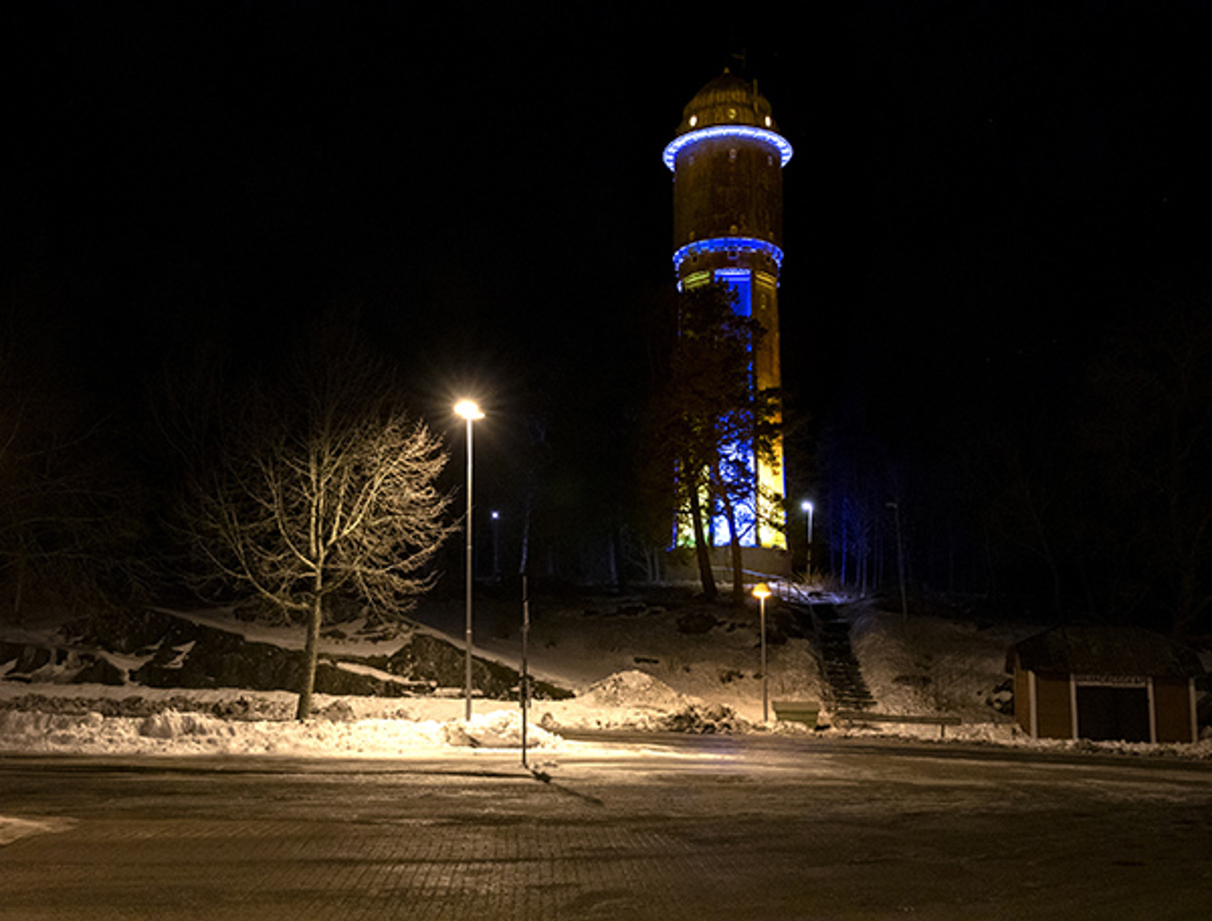 Att lysa upp vattentornet i Östhammar i gult och blått är ett sätt att uttrycka vår solidaritet med Ukraina och Ukrainas folk.