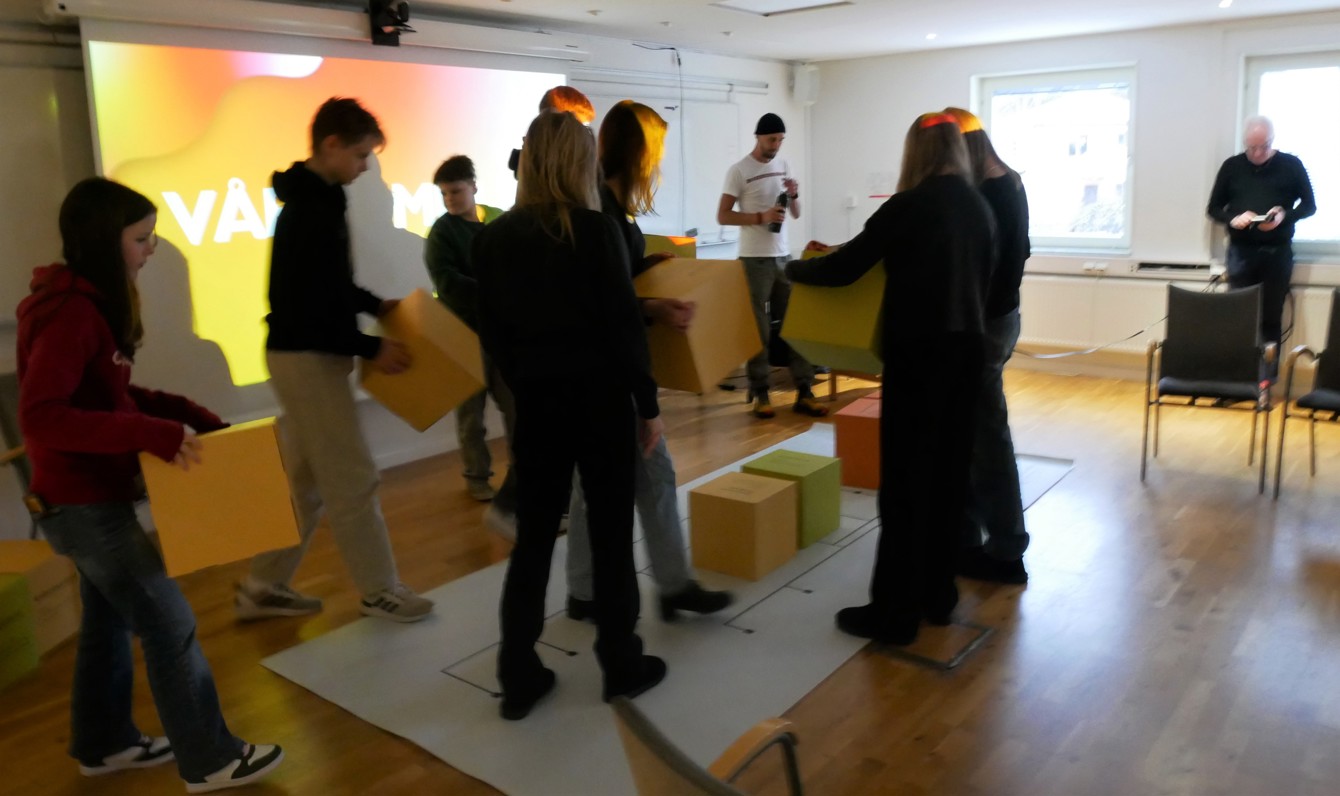 När klockan hade slagit tio så började nästa pass för ungdomarna - ”Så styrs vår kommun”. Eleverna fick lära sig mer om vad demokrati är och fick delta i en frågesport via ”Menti”, ett webbaserat verktyg för att skapa interaktiva och engagerande omröstningar. Mot slutet av passet så rullade Malin Arrendell, projektledare, ut ett stort papper på golvet med ritade streck som kanske kan liknas vid ett släktträd. Ett par meter bredvid det så stod det olikfärgade kuber med text staplade på varandra. Ett exempel på text kunde vara ”Bygg- och miljönämnd” samt en kort beskrivning av nämndens ansvar. Eleverna fick plocka och placera ut varsina kuber och försöka gissa rätt på olika ansvarsområden. Eleverna fick nästan alla kuberna rätt.