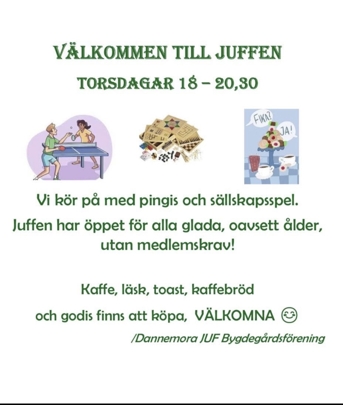 Välkommen till Spelkväll på Juffen. Vi har två pingisbord, cornhole, dart samt massor av sällskapsspel. Kaffe, läsk… läs mer inne i evenemanget
